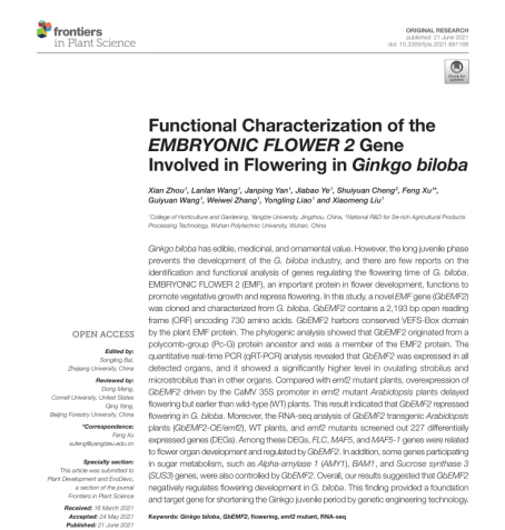 (通讯员 刘晓梦 何筱)2021年6月,我中心2020级博士研究生周仙以第一作者身份在植物学国际期刊Frontiers in Plant Science发表题为《Functional Characterization of the EMBRYONIC FLOWER 2 Gene Involved in Flowering in Ginkgo biloba》(10.3389/fpls.2021.681166)的论文(图1),通讯作者为许锋教授,350vip浦京集团为第一署名单位。