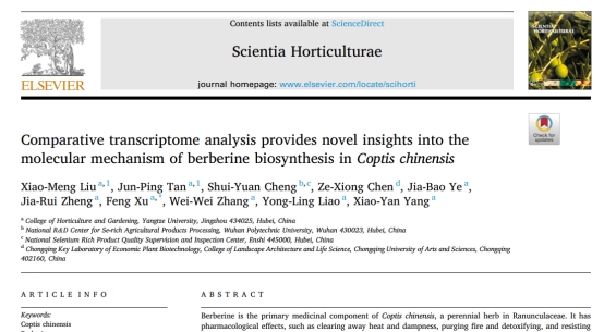 今日,我中心2019级博士研究生刘晓梦在国际权威杂志《Scientia Horticulturae》(园艺学2区,影响因子3.463)上发表了题为Comparative transcriptome analysis provides novel insights into themolecular mechanism of berberine biosynthesis in Coptis chinensis”的研究论文。刘晓梦博士为论文第一作者,许锋教授为通讯作者,350vip浦京集团为第一署名单位。