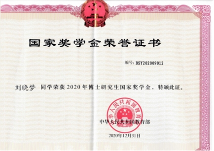 至此,我中心刘晓梦博士以优异的课程成绩和丰富的科研成果,已经连续两年获得博士国家奖学金。