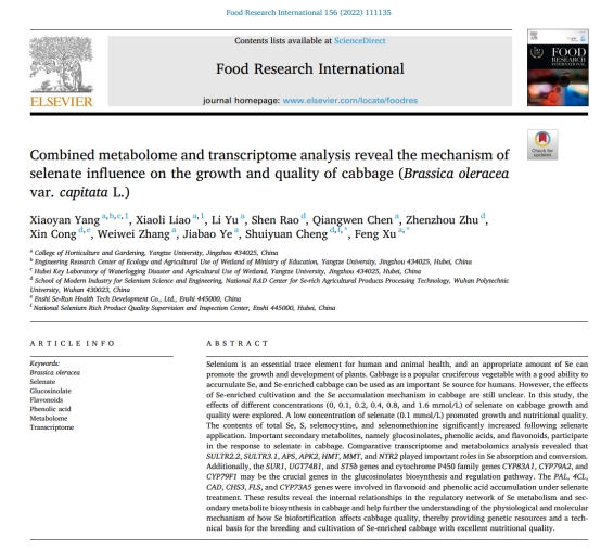 近日,我中心博士后杨晓燕在国际学术期刊《Food Research International》(农林科学1区,影响因子6.475)上发表了题为“Combined metabolome and transcriptome analysis reveal the mechanism of selenate influence on the growth and quality of cabbage (Brassica oleracea var. capitata L.)”的研究论文。杨晓燕博士为第一作者,许锋教授为通讯作者,350vip浦京集团为第一署名单位。