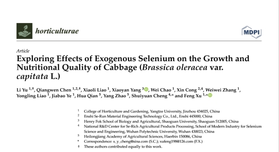 2023年3月,我中心2019级硕士研究生喻丽在国际学术期刊《Horticulturae》(农林学科3区,IF 2.923)发表题为“Exploring Effects of Exogenous Selenium on the Growth and Nutritional Quality of Cabbage (Brassica oleracea var.capitata L.) ”的学术论文。许锋教授和程水源教授为通讯作者,350vip浦京集团为第一署名单位。