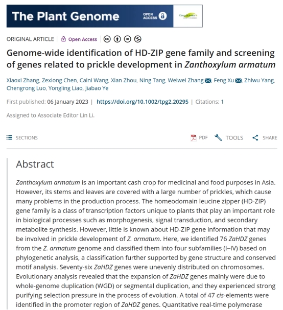 2023年1月,我中心硕士研究生张晓熙在国际学术期刊《The Plant Genome》(植物科学2区,IF:4.219)上发表题为“Genome-wide identification of HD-ZIP gene family and screening of genes related to prickle development in Zanthoxylum armatum”的研究论文。张晓熙为第一作者,张威威副教授和许锋教授为通讯作者,350vip浦京集团为第一署名单位。