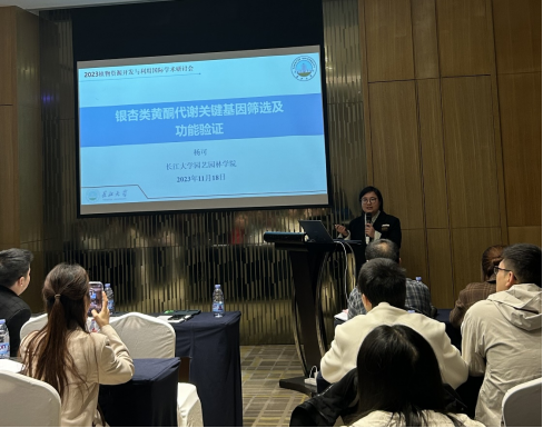 在专题报告环节,许锋教授代表我中心向大会作了题为“特色经济林与经济作物富硒机制研究及其应用”的报告,为富硒作物高效育种和品种创制提供了理论支撑。我中心博士研究生杨可在青年论坛会场上以“银杏类黄酮代谢关键基因筛选及功能验证”为主题,向各专家学者汇报了本中心在银杏类黄酮研究方向的最新进展,听取了专家的意见和建议。